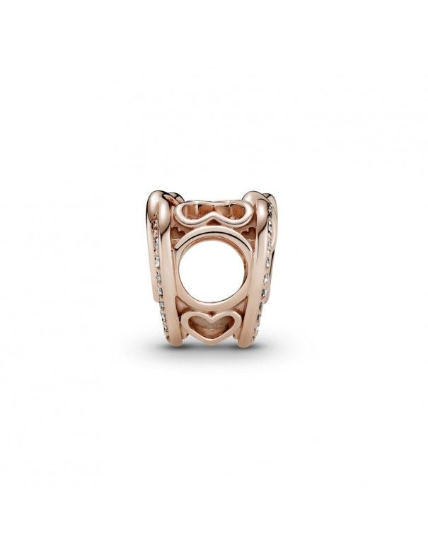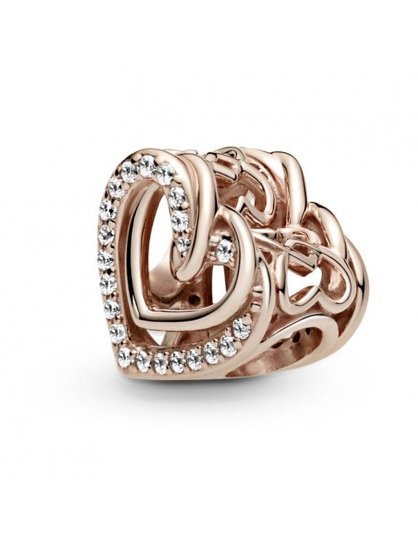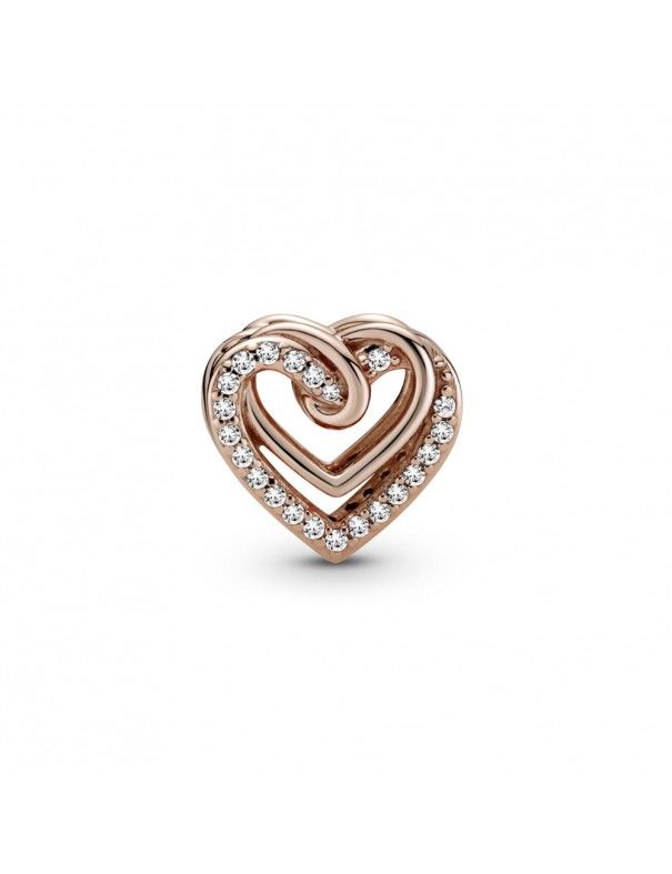 Charm Pandora Rose Doble Corazones Entrelazados 789270C01, es una aleación especial de metales con recubrimiento en oro de 14k y decorado con circonitas transparentes.