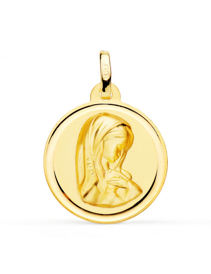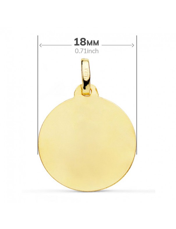 Medalla de oro amarillo Virgen Niña M9193-118. Está fabricada en oro de primera ley de 18 quilates y mide 18 mm de diámetro. Peso aproximado 1,60gr. La parte trasera es lisa matizada. Garantía de tres años.