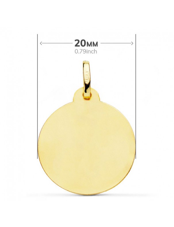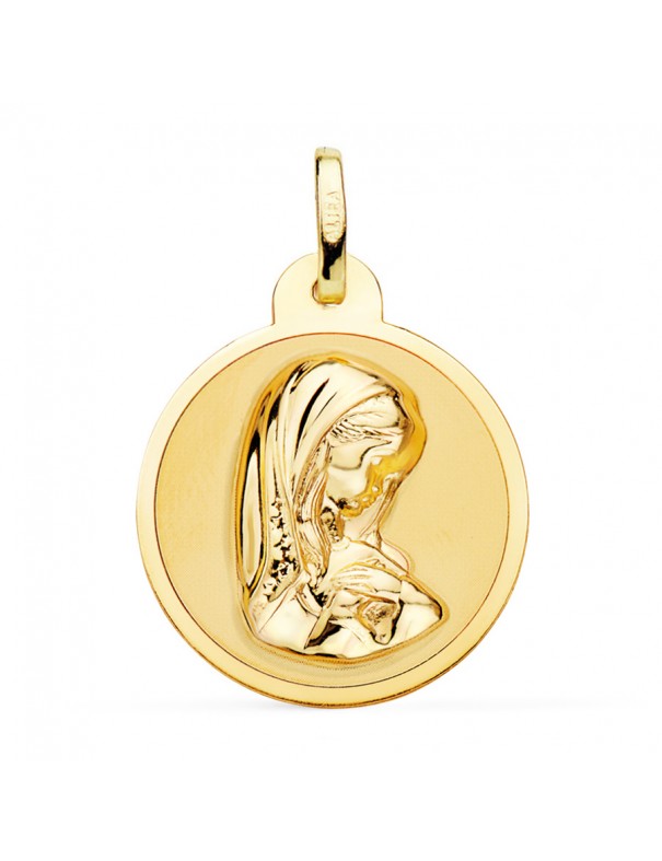 Medalla de oro amarillo Virgen Niña M9193-820. Está fabricada en oro de primera ley de 18 quilates y mide 20 mm de diámetro. Peso aproximado 2,20gr. La parte trasera es lisa matizada. Garantía de tres años.