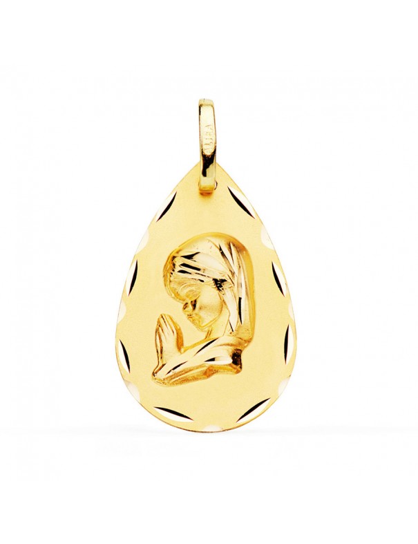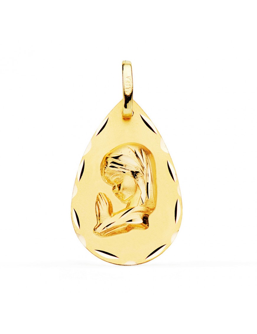 Medalla de oro amarillo Virgen Niña M9177-323. Está fabricada en oro de primera ley de 18 quilates, tiene forma de gota y mide 23 mm de alto y 15mm de ancho. Peso aproximado 1,60gr. La parte trasera es lisa matizada. Garantía de tres años.