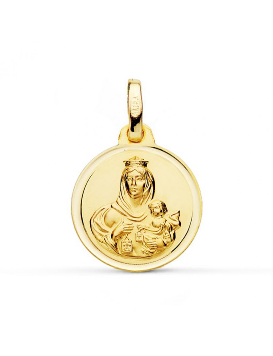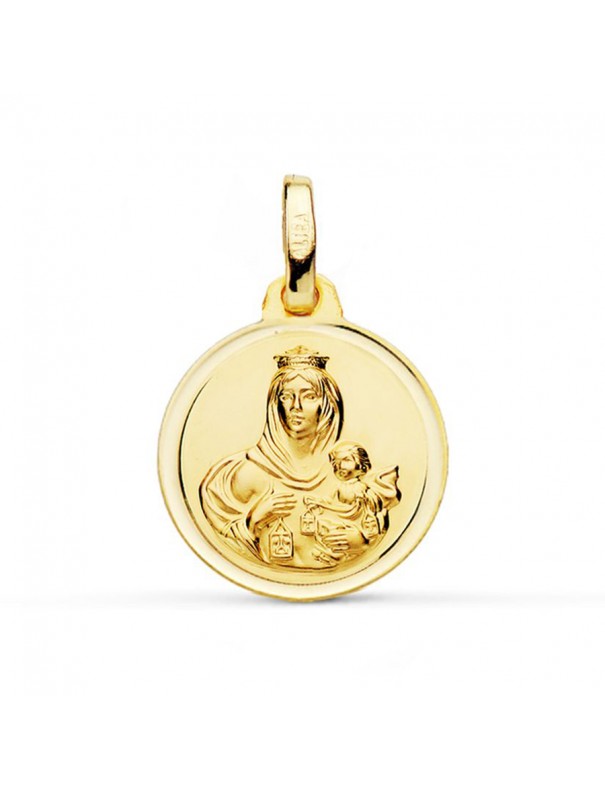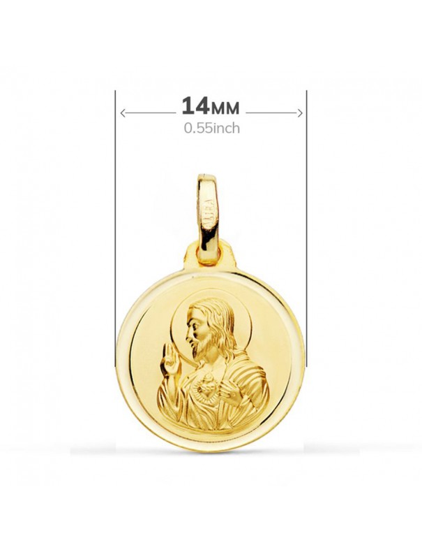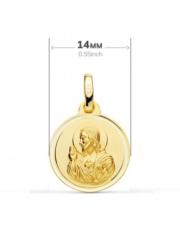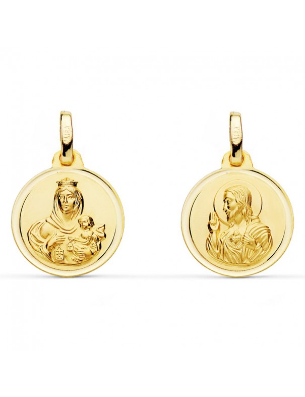 Escapulario Oro 18kts 14mm M5003-114, fabricado en oro amarillo de 18kts. Tiene un diámetro de 14mm. Por un lado tiene representada la Imagen Virgen del Carmen y por el otro el Corazón de Jesús. Peso aproximado 1,10 gr.