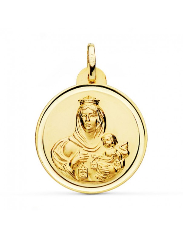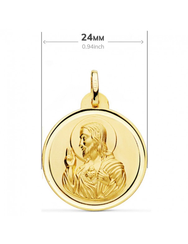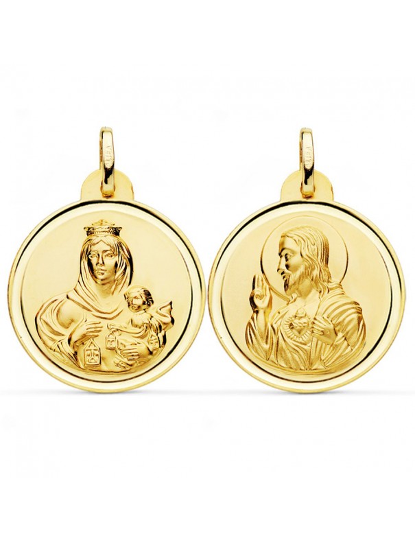 Escapulario Oro 18kts 24mm M5003-124, fabricado en oro amarillo de 18kts. Tiene un diámetro de 24mm. Por un lado tiene representada la Imagen Virgen del Carmen y por el otro el Corazón de Jesús. Peso aproximado 3 gr.