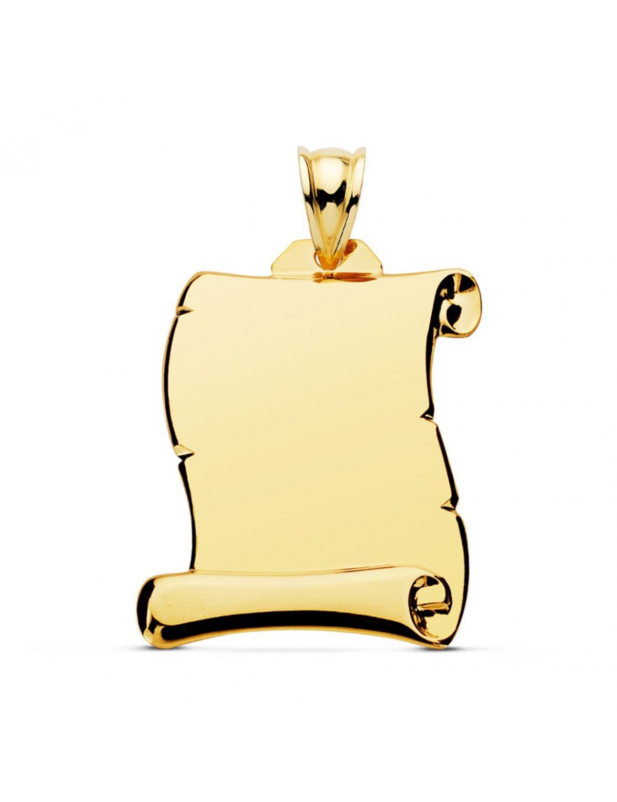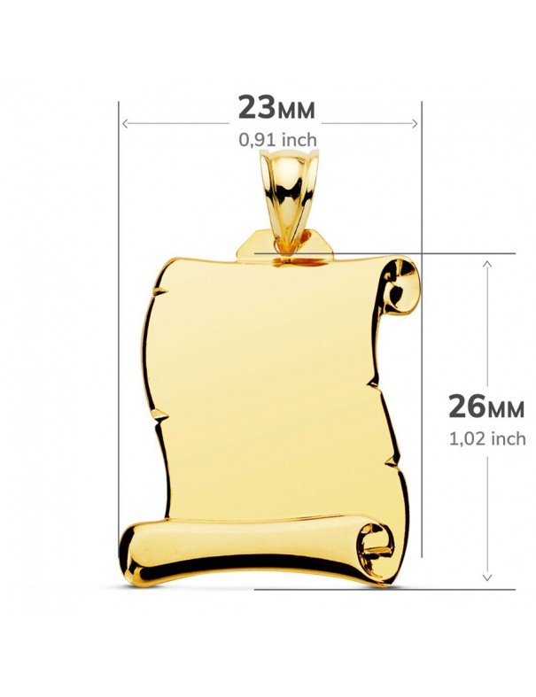 Chapa pergamino Oro amarillo M6440-26. Es una placa fabricada en oro de 18 quilates acabado en brillo. Mide 26x23 milímetros. Incluye grabación gratuita. Tiene 3 años de garantía contra defectos de fabricación