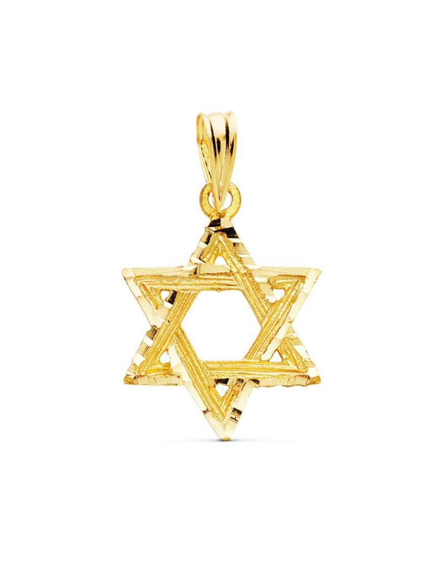 Colgante Estrella de David Oro Amarillo M264. Fabricado en oro amarillo de 18 kts. Mide 16mm. Tiene un peso aproximado de 0,85 gr.