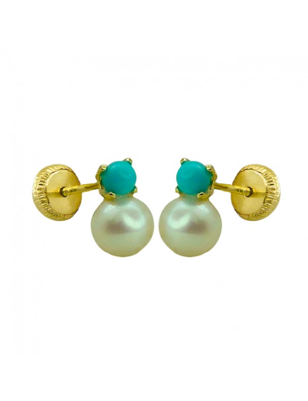 Pendientes Oro Perla 3.5mm y Bola Turquesa 2646. Pendientes de oro 18k con garra que sujeta una bola turquesa sobre una perla blanca que mide 3.5mm. Tiene cierre de rosca.