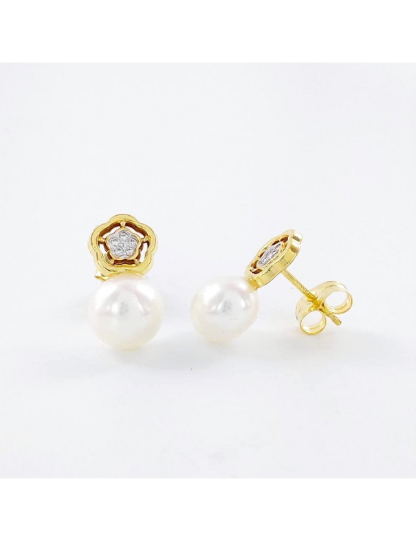 Pendientes Oro Perla Circonitas 05511799P. Pendientes de oro amarillo de 18k con forma de flor adornada con circonitas y una perla. Tiene cierre de presión.