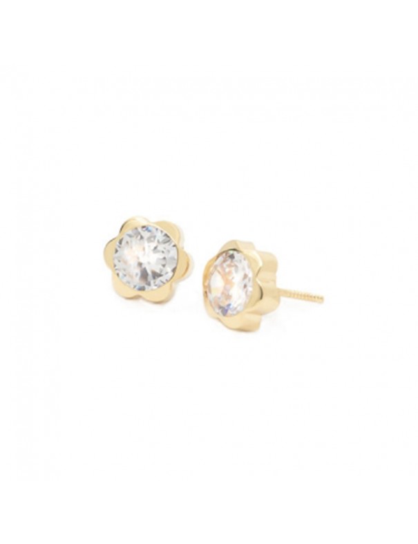 Pendientes Eles Oro 9kts Flor Brillante 91A1032. Pendientes niña de oro amarillo de 9kts con forma de flor adornada con una circonita de 5mm. Tiene cierre de rosca.