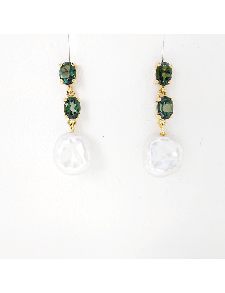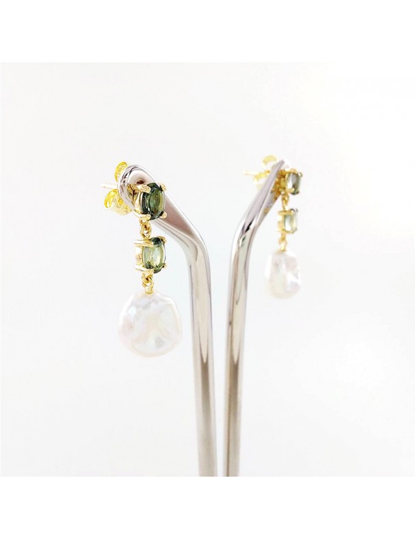 Pendientes Oro Topacio Verde y Perla Barroca 05512127PP1. Pendientes de oro amarillo de 18k largos con topacio verde y perla barroca.