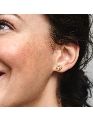 Pendientes de botón Pandora Conchas Marinas de La Sirenita de Disney 262686C01 para mujer. Están realizados en una aleación especial de metales con baño de oro amarillo de 14 kts y con una perla de cristal. Garantía de tres años.