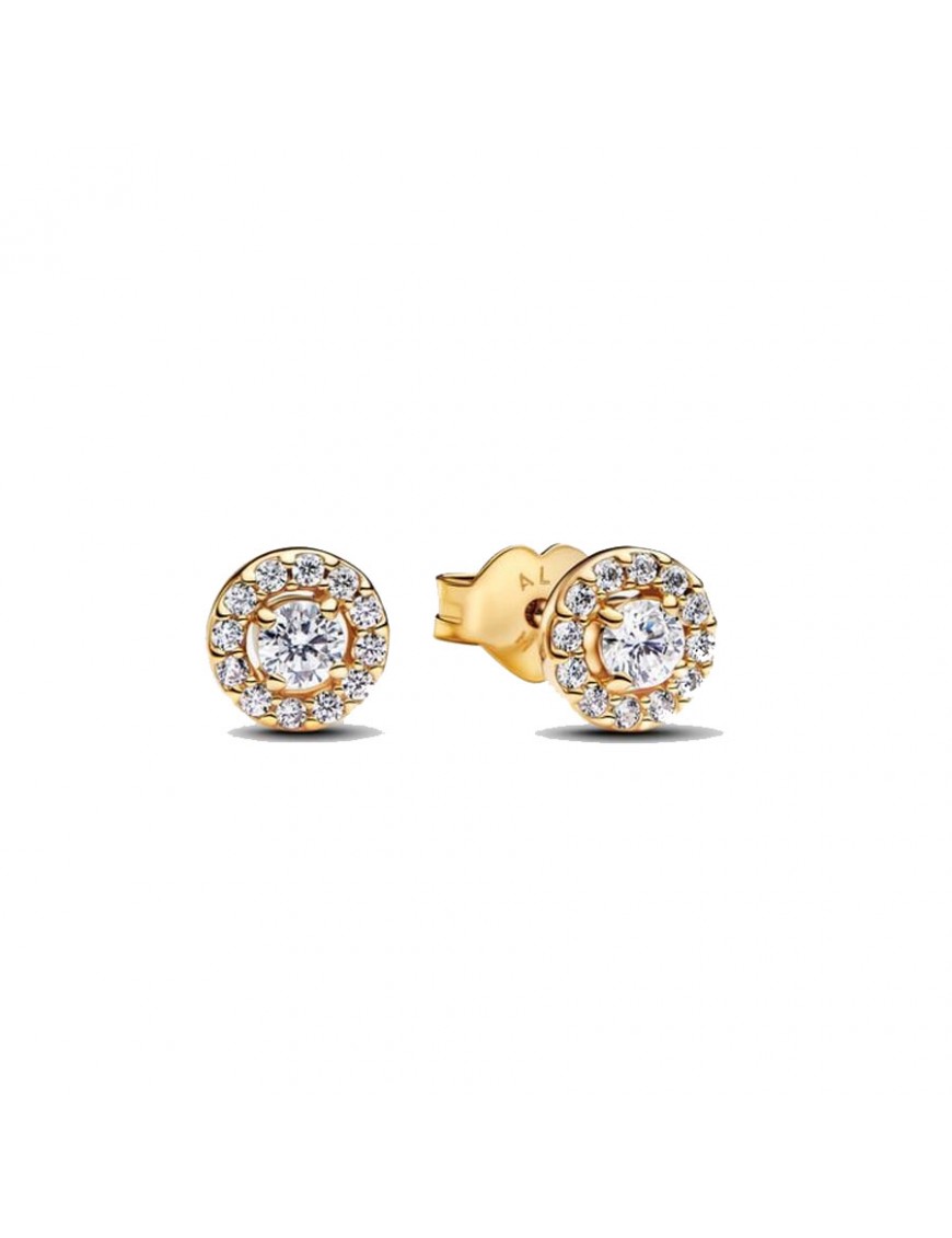 Pendientes Pandora de Botón Halo Redondo en Pavé 263019C01. Están fabricados en una aleación especial de metales con baño de oro de 14 kts. y circonitas. Llevan cierre de presión.