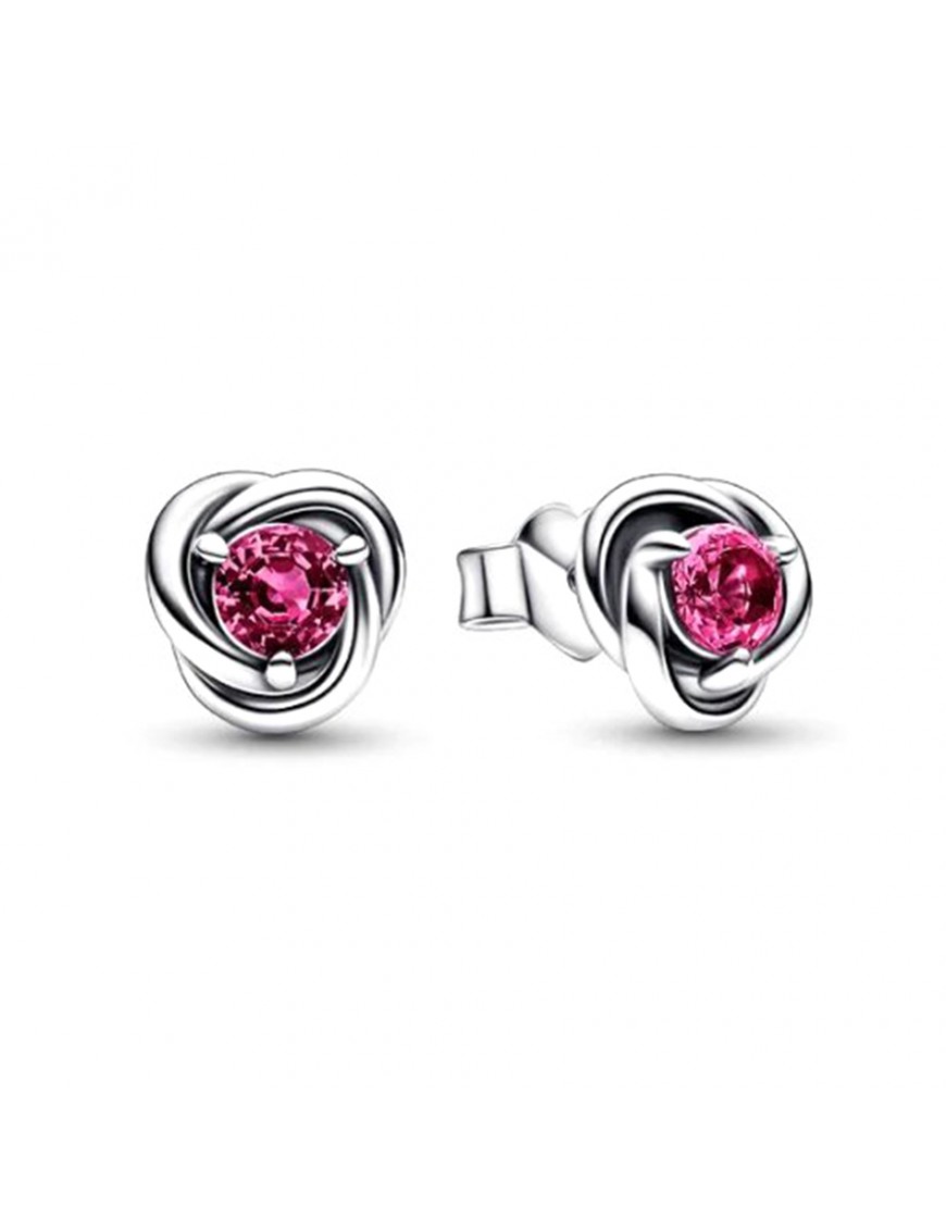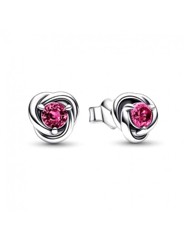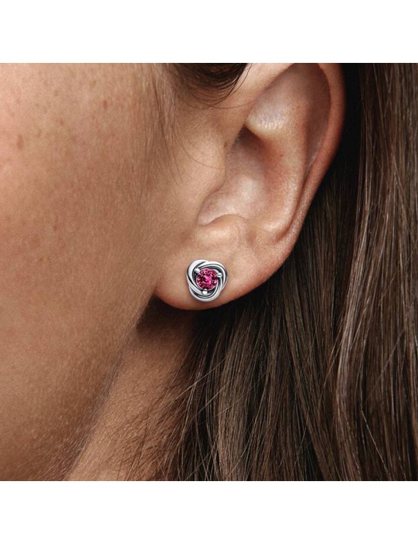 Pendientes Pandora de Botón Círculo Eternity Octubre 292334C05. Fabricados en plata de ley 925 con acabado plateado, estos pendientes de botón presentan un diseño tipo lazo infinito con un cristal rosa de síntesis en el centro que aporta un sutil brillo y simboliza la eternidad.