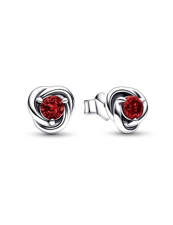 Pendientes Pandora de Botón Círculo Eternity Enero 292334C06. Fabricados en plata de ley, presentan un acabado plateado y lucen un cristal sintético de color rojo en el centro del diseño de lazo entrelazado que simboliza la eternidad.