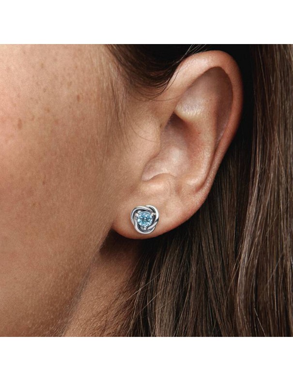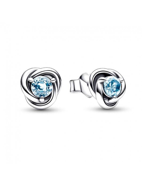Pendientes Pandora de Botón Círculo Eternity Marzo 292334C09. Estos pendientes están fabricados en plata de ley 925 con acabado pulido, presentan un delicado diseño de trenza infinita en color plateado y cuentan con un cristal sintético azul aguamarina en el centro que aporta brillo y simboliza eternidad.