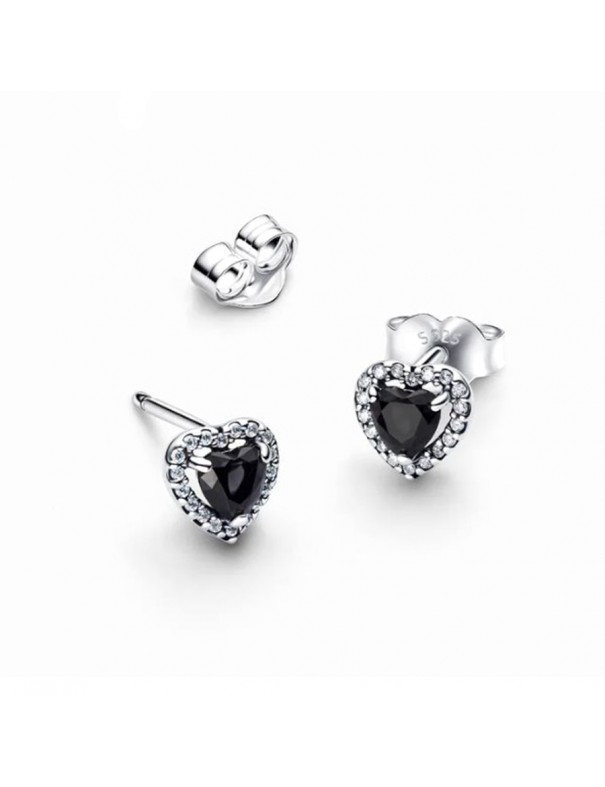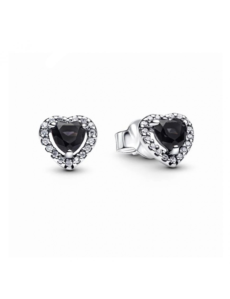 Pendientes Pandora de Botón Corazón Elevado 298427C03. Creados en plata de ley, de color plateado con un cristal sintético negro en forma de corazón rodeado por un pavé de circonitas cúbicas blancas que aportan brillo. Tiene un estilo elegante y llamativo, con aire moderno.