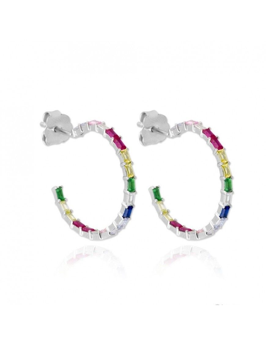 Pendientes de plata aro colores 151653. Son de plata de primera ley de 925 mls con baño de rodio y circonitas de colores. Llevan cierre de presión y miden 22 mm de alto. Garantía de dos años contra defectos de fabricación.