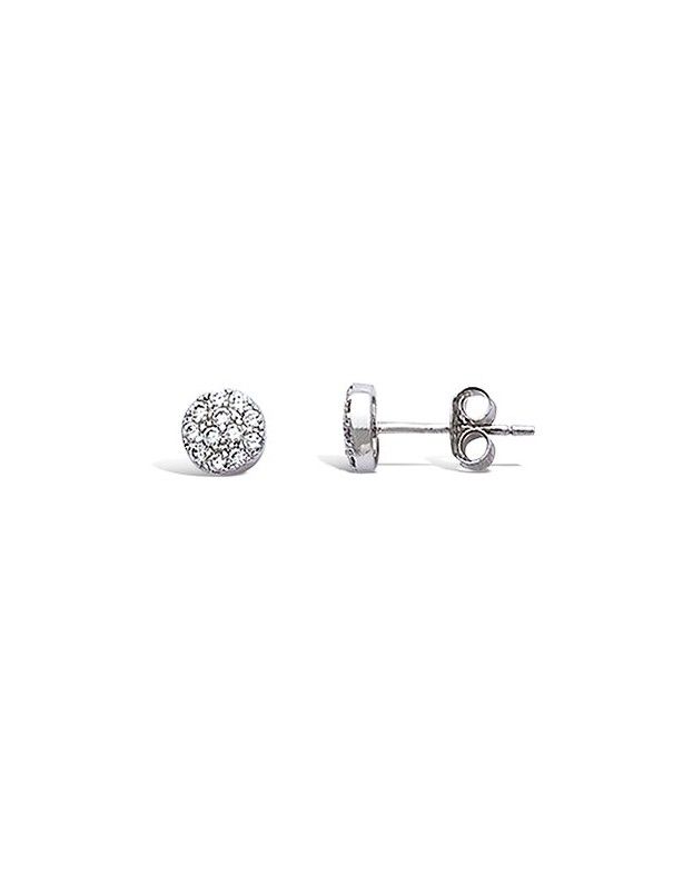 Pendientes De Plata Redondos Pequeños 21EN110CZ, fabricados en plata de ley 925mls y circonitas. Cierre de presión y diámetro de 6mm. Garantía de dos años contra defectos de fabricación.