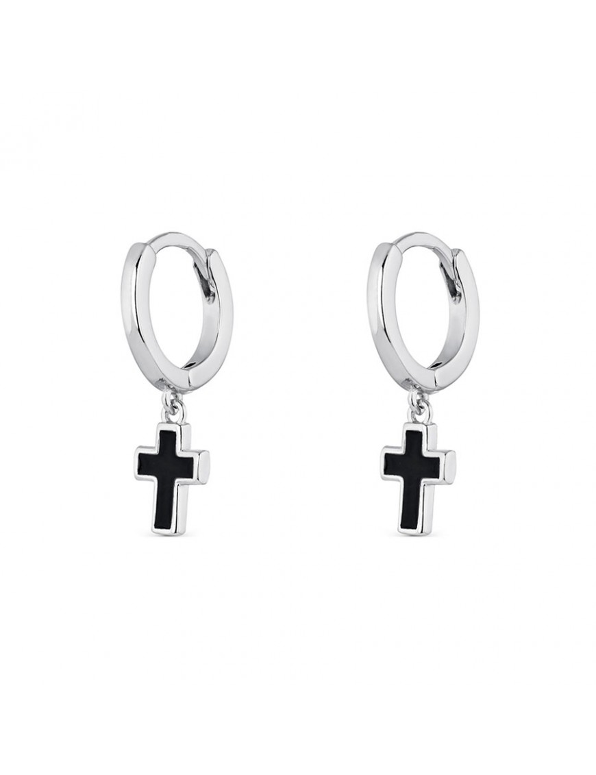 Pendientes de plata con cruz negra 9111401 unisex. Está fabricados en plata de primera ley de 925 mls con esmalte negro. Cierre estilo criolla de presión. Garantía de tres años.