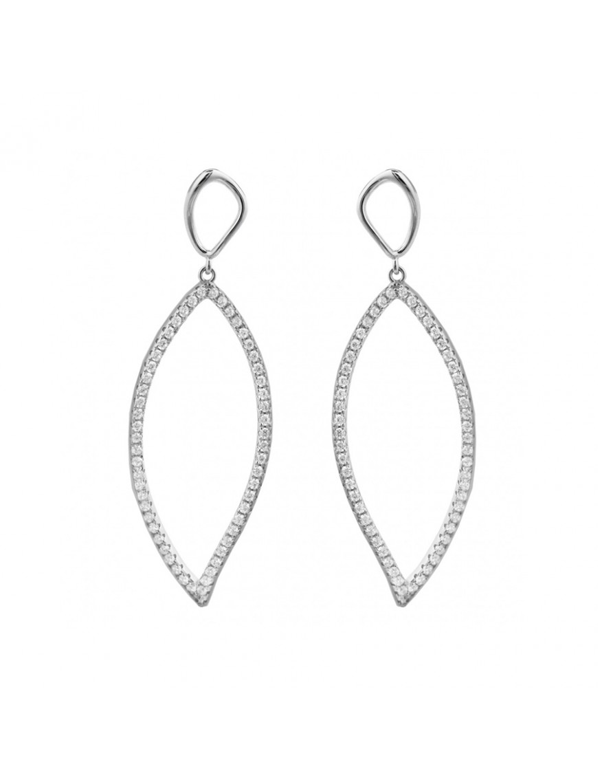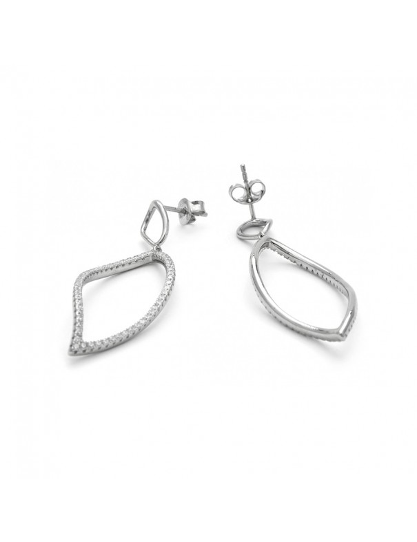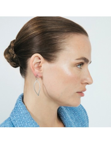 Pendientes Luxenter Zorne Plata EJ1030000. Elaborados en plata de ley 925 con acabado en rodio y diseño ondulado de 51 × 16 mm. El color principal es plata con detalles brillantes aportados por circonitas blancas. Tienen una forma elegante y alargada con curvas suaves que crean movimiento visual. Cuentan con cierre de presión para ajuste seguro en la oreja.