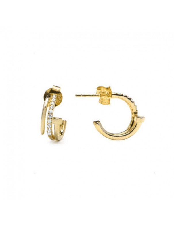 Pendientes Luxenter Sahder EF209Y0000. Elaborados en plata de ley con baño en oro amarillo, acabado brillante. Presentan forma de aro pequeño tipo huggie con diseño doble línea. Incorporan circonitas blancas engastadas en una de las bandas frontales. Cuentan con cierre cómodo de presión.