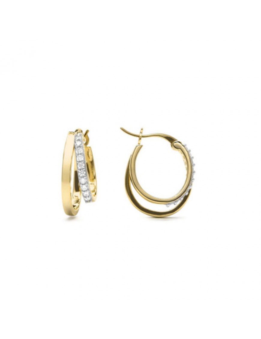 Pendientes Luxenter Thisda Plata NO037Y0000. Elaborados en plata de ley 925 con acabado en oro amarillo de 18 k, color dorado elegante. Presentan forma de aros medianos con cuerpo ligeramente curvado y líneas limpias. Incorporan circonitas blancas brillantes engastadas que aportan destellos de luz. Cuentan con cierre de criolla (tipo aro) para un ajuste cómodo y seguro.