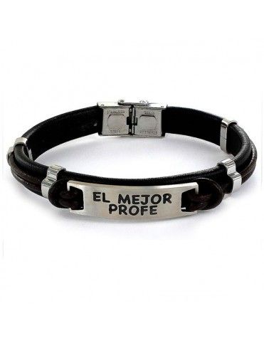 Pulsera Acero Hombre Mejor Profe 9098596. Es una pulsera para hombre, realizada en acero antialérgico y cuero. Grabado con la frase "el mejor profe".