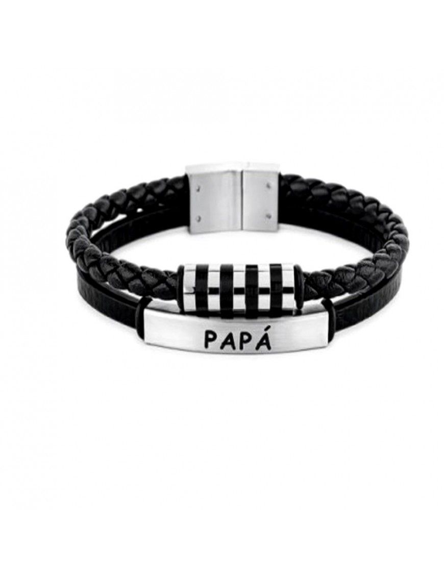 Pulsera De Acero Hombre Doble Papá 9111270, en acero hipoalergénico y cuero color negro. Compuesta por dos tiras de cuero y decoradas con abalorios y chapa central de acero. Chapa con grabación "PAPÁ". Cierre magnético.