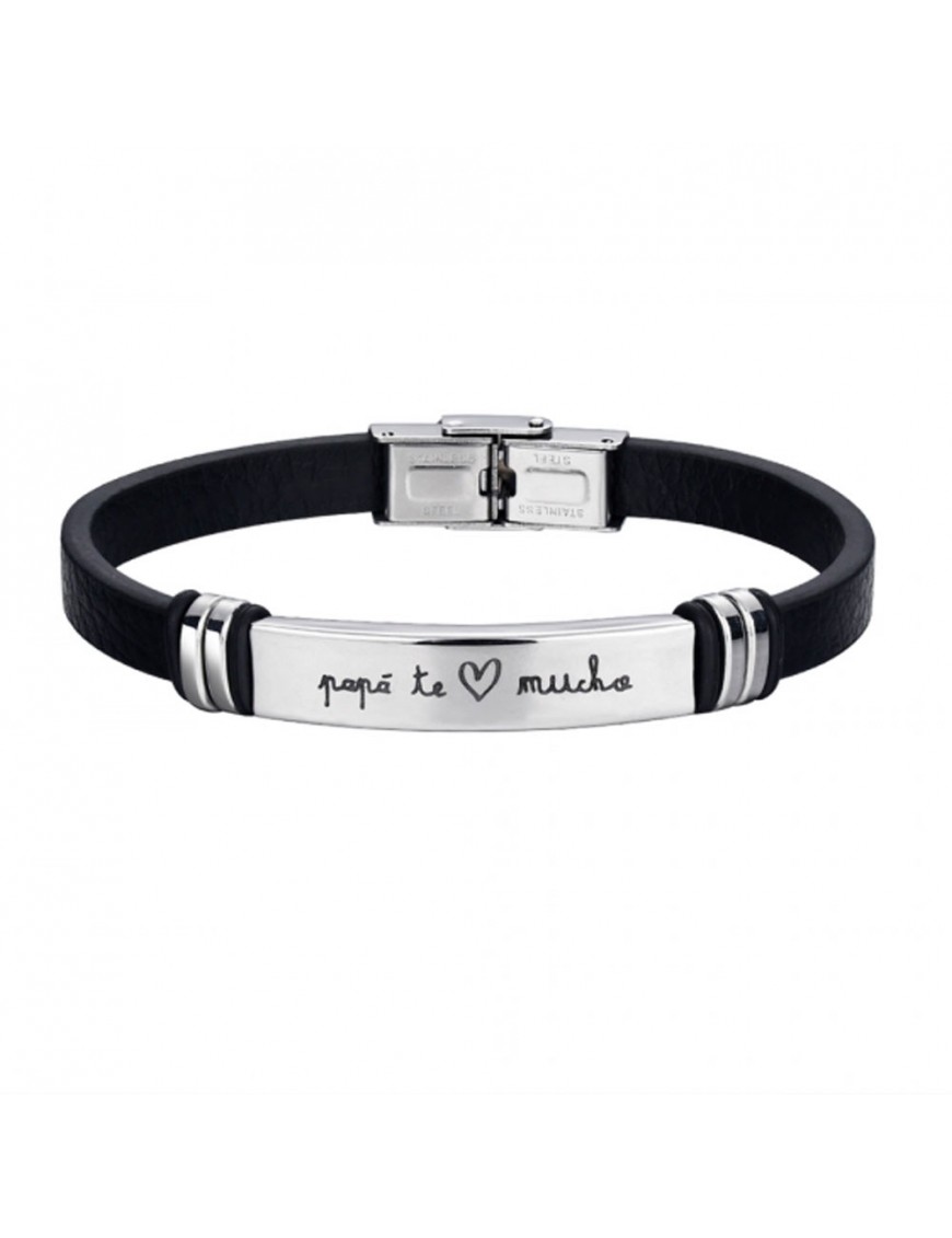Pulsera Acero Caballero Papá te quiero Mucho 9116443 y cuero en color negro. Grabación decorada con esmalte negro. Longitud de 21cm aproximadamente ajustable.