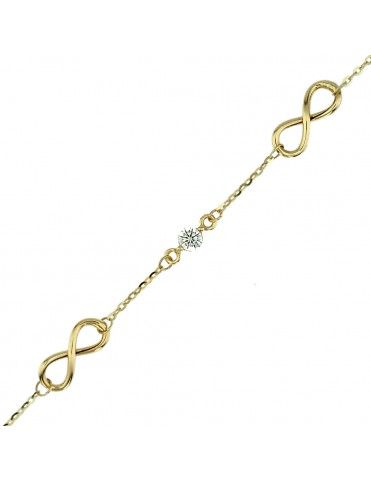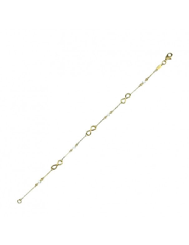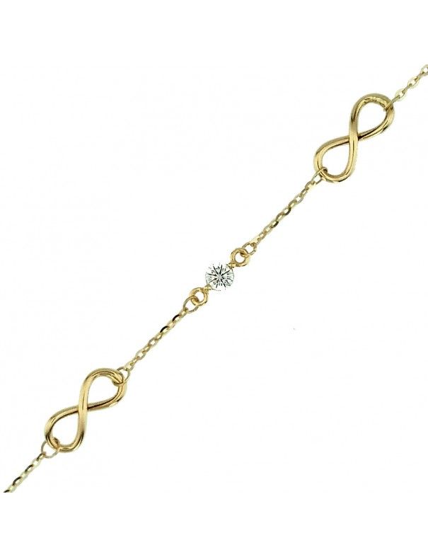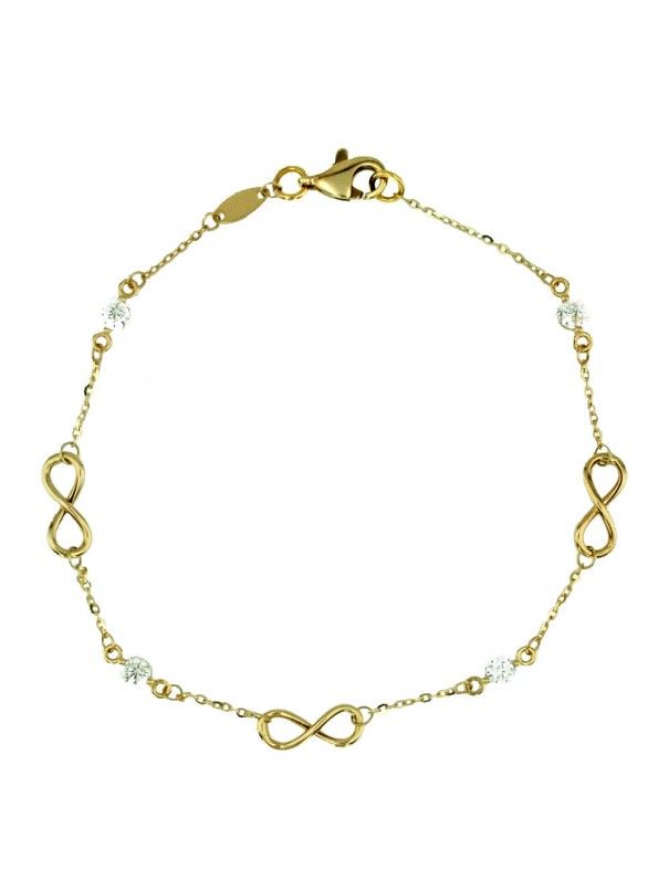 Pulsera Oro Amarillo 18k Infinitos Y Circonitas 401-00861, fabricada en oro de 18k y circonitas. Un total de tres símbolos de infinito y cuatro circonitas. Longitud de 18cm. Cierre de mosquetón. Peso 2.150gr.