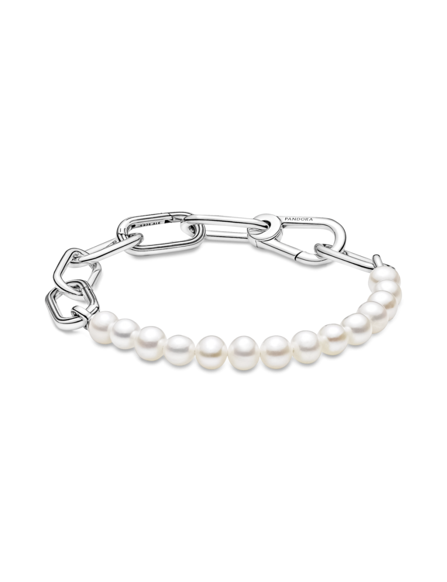 Pulsera Cadena De Eslabones Y Perlas Cultivadas Pandora Me 599694C01-3, en plata de primera ley 925mls y perlas cultivadas de agua dulce. Presenta dos conectores que se pueden abrir y separar. Personaliza tu cadena de eslabones y añade links o links dobles. Posbilidad de añadir medallón de Pandora Me o hasta ocho charms colgantes Pandora Me en cada conector que pueda abrirse.