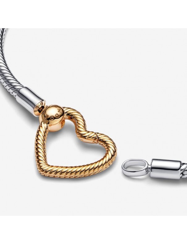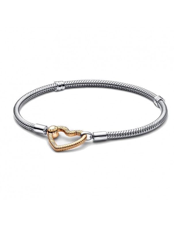 Pulsera Pandora Moments Cierre Corazón 569539C00-18, de plata de primera ley 925mls y cierre de metal con recubrimiento electrolítico de oro de segunda ley de 14kts. Longitud de 18cm.