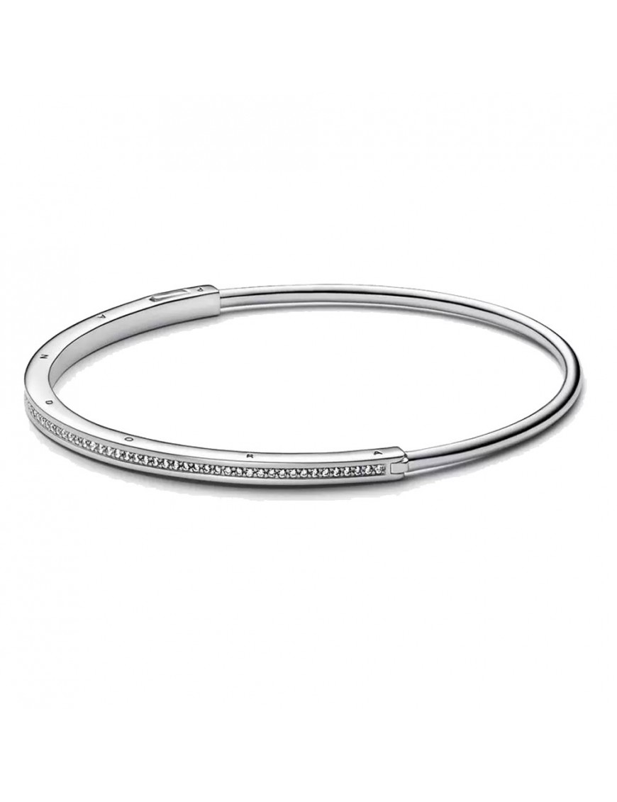 Pulsera Rígida Pandora Signature I-D Pavé 592313C01-1, en plata de primera ley 925mls, decorada con circonitas cúbicas transparentes. Cierre de bisagra.