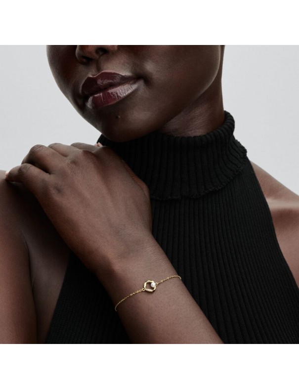 Pulsera Círculo Forma Orgánica en Pavé y Perla Cultivada de Agua Dulce Tratada 563830C01-18. La pulsera está fabricada con una aleación de metales recubierta en oro de 14k, decorada con circonitas cúbicas brillantes y una perla cultivada de agua dulce tratada, cada una única por naturaleza. Su diseño orgánico simboliza la libertad de expresión y está acabado a mano. Es una talla 18.
