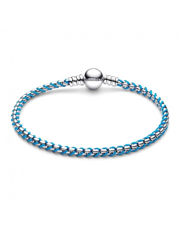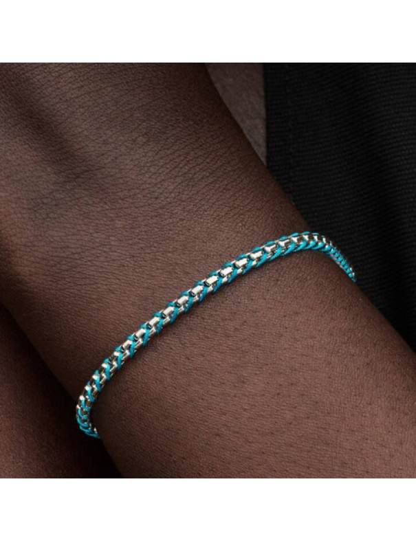 Pulsera Pandora Cadena Caja Cordón Azul 593816C01-17. Eleva tu estilo con esta pulsera de cadena caja en plata de primera ley, entrelazada con un delicado cordón azul turquesa a lo largo de sus eslabones. Cómoda y resistente, perfecta para el día a día. Es una talla 17