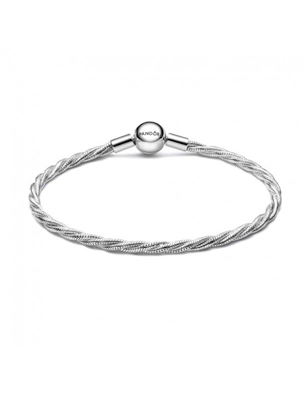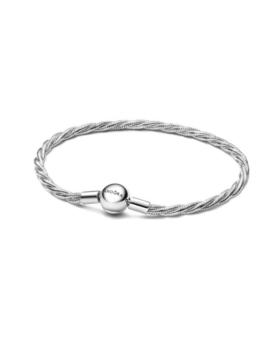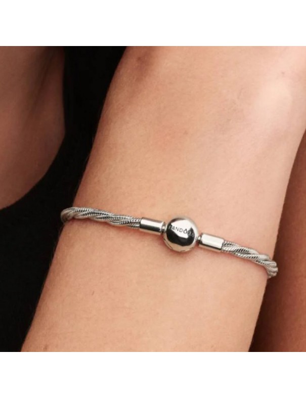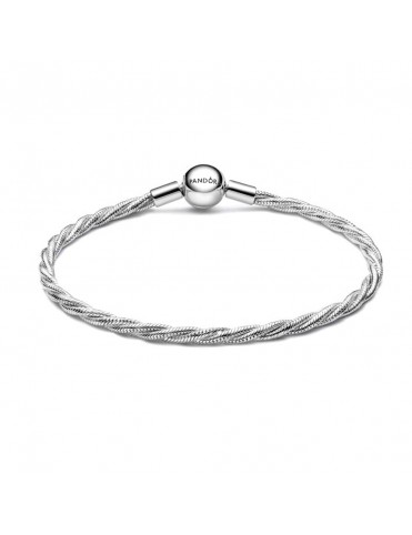 Pulsera Pandora Cadena de Serpiente Trenzada con Cierre de Bola de Pandora 593757C00-20. Fabricada en plata de ley 925 con un diseño trenzado de tres cadenas tipo serpiente, esta pulsera luce un elegante acabado plateado y presenta un cierre redondo grabado con el logotipo de la marca, ideal para lucir hasta 18 charms.