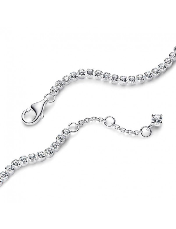 Pulsera Pandora Tenis Brillante 593927C01-18. Confeccionada en plata de ley 925 de color plateado con acabado pulido. Presenta una hilera continua de circonitas cúbicas transparentes que recorren todo su contorno, aportando brillo y elegancia. Su diseño tipo tenis la hace versátil para usar sola o combinada con otras piezas.