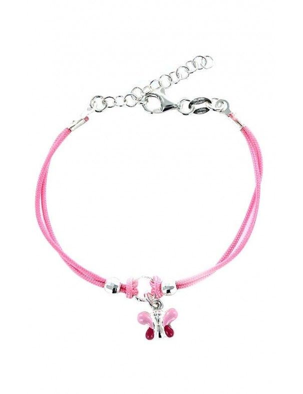 Pulsera Plata Princess niña 9084413. Pulsera realizada con hilo de algodón rosa y plata de ley de 925 mls. Está decorada con una figura de mariposa esmaltada en tonos rosas. La pulsera mide de largo 14 cm ampliables a 17 cm. La garantía de este artículo es de 2 años.