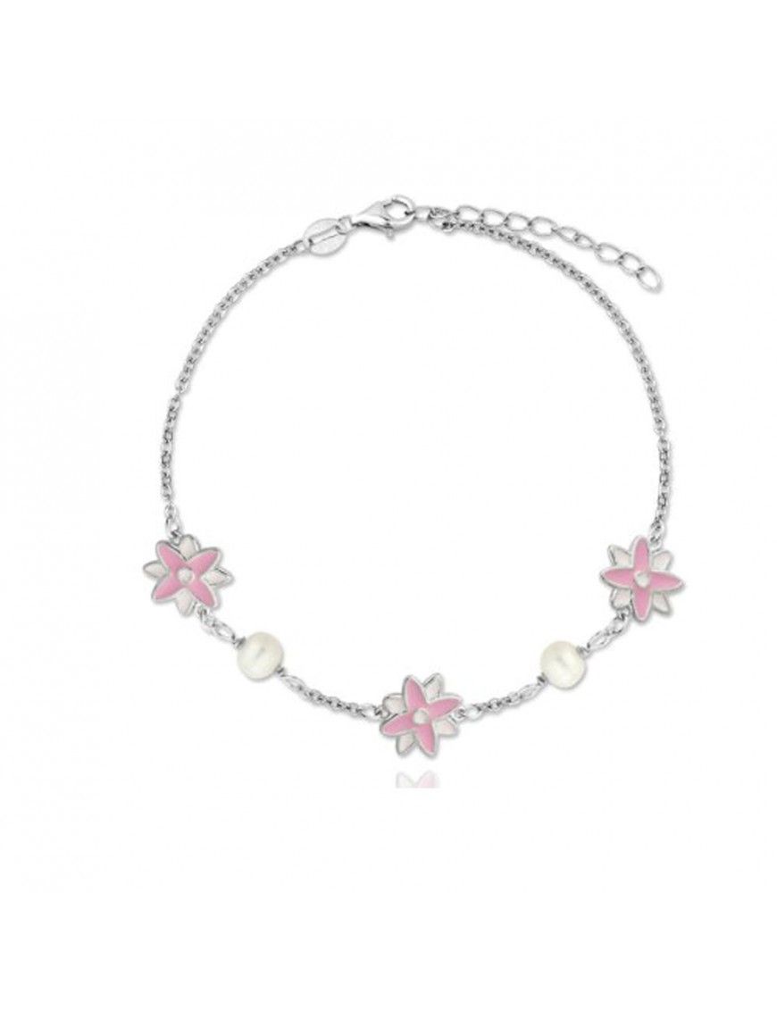 Pulsera De Plata Flores Esmalte Rosa Perlas 710050, fabricada en plata de primera ley 925mls y baño de rodio. Flores de 7,5X7,5mm decoradas con esmalte rosa y blanco. Perlas de 4mm de diámetro. Longitud de 14cm con cadenilla de ajuste de 3cm.