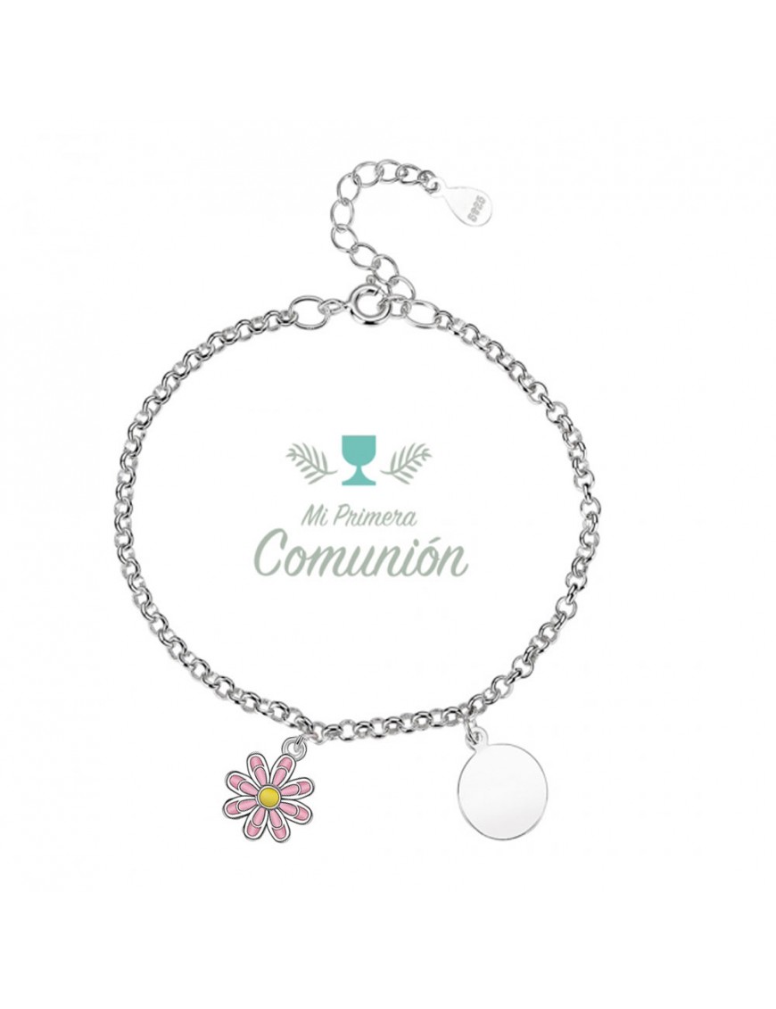 Pulsera De Plata Niña Flor 9113516, en plata de primera ley 925mls. Cadena tipo rolo de 15cm con cadenilla de ajuste de 3cm. Cierre de mosquetón. Mariposa decorada con esmalte y disco de 10mm de diámetro.