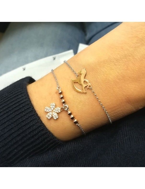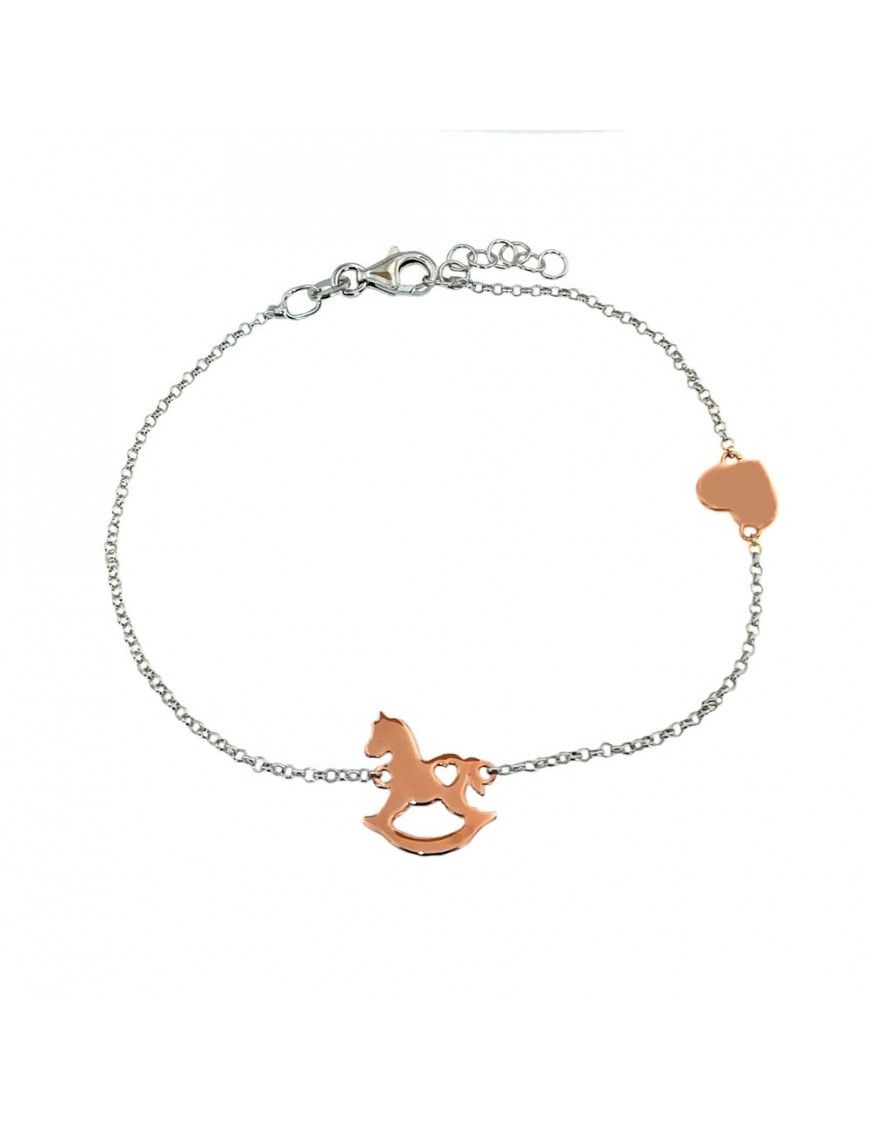 Pulsera plata BRT7180. Es una pulsera de plata de ley 925 mls con un corazón y un caballito con baño de oro rosa. tiene una longitud de 17+3 centímetros gracias a su cadenilla. Es alta joyería en plata con dos años de garantía. Enviamos nuestros producto con un envoltorio especial para regalo de manera gratuita
