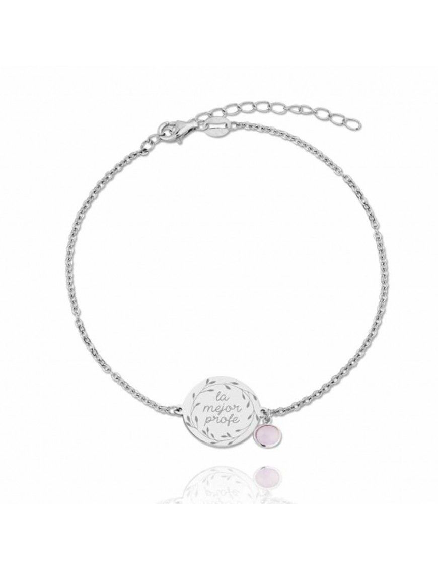 Pulsera De Plata La Mejor Profe 115625, en plata de primera ley 925mls y baño de rodio. Longitud de 17cm y cadenilla de ajuste de 3cm. Cierre de mosquetón. Chapa de 16mm de diámetro, decorada con grabación y esmalte negro. Acompañada de circonita de color.