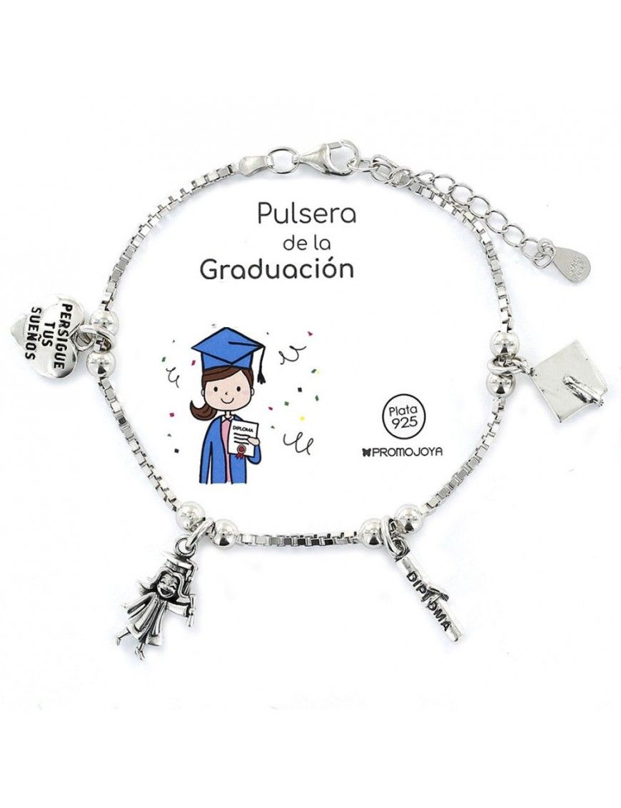 Pulsera De Plata Graduación 9107469, en plata de primera ley 925mls y baño de rodio. Cadena veneciana de 15cm de largo con cadenilla de ajuste de 3cm. Decorada con cuatro colgantes. Cierre de mosquetón.