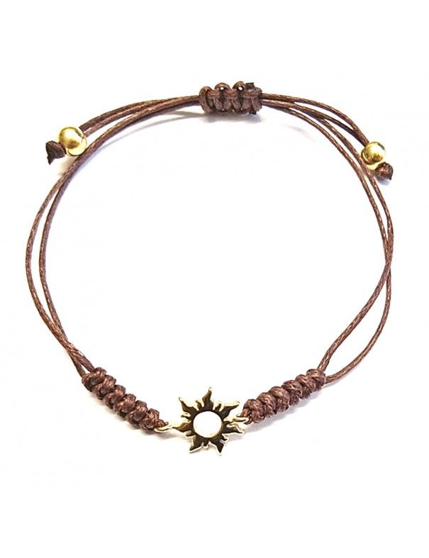 Pulsera Plata Chapada Macramé Sol 048118-2-1, en plata de primera ley 925mls bañada en oro de 18kts de 2 micras. Pulsera de cordón marrón ajustable. Diámetro máximo de 23cm.
