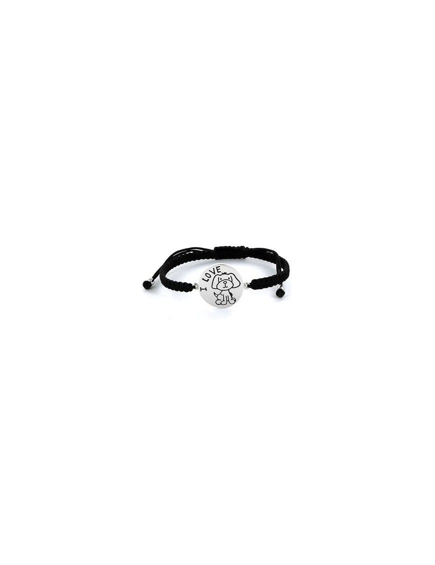 Pulsera De Plata Cordón I Love Dog 9100171, en plata de primera ley y cordón negro. Chapa de 18mm de diámetro. Grabación decorada con esmalte negro. Diámetro máximo de 22,5cm.