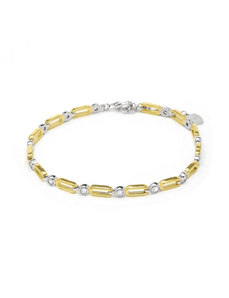Pulsera Luxenter Usol Plata Bicolor BX479M0000. Creada en plata de ley con acabado bicolor en oro amarillo y rodio, compuesta por eslabones rectangulares con pequeños chatones de circonitas brillantes intercalados. El color combina tonos plateados y dorados con destellos blancos de las piedras. Tiene forma de cadena fina y elegante con cierre de mosquetón y anillas alargadoras para ajustar la longitud aproximada de 19 cm.