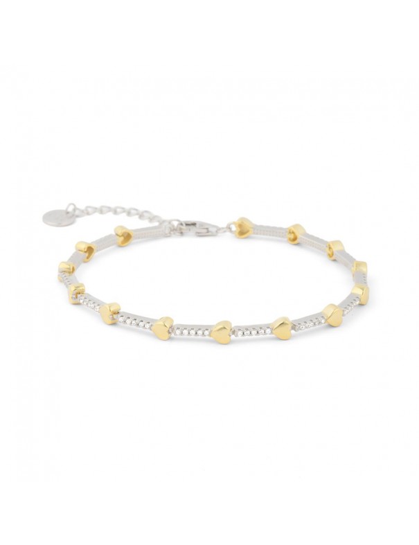 Pulsera Luxenter Yibael Plata Bicolor BX485M0000. Creada en plata de ley 925 con acabado plateado y diseño sencillo de banda metálica con circonitas continua y motivos de corazones dorados. Tiene cierre integrado tipo pulsera rígida.