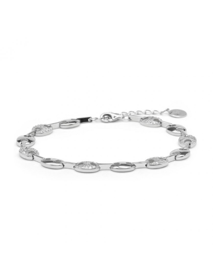 Pulsera Luxenter Mione Plata BX4860000. Creada en plata de ley con acabado de rodio y eslabones rectangulares alternando zonas lisas y otras con circonitas blancas brillantes engastadas, color plateado y brillo claro de las piedras. La forma es de cadena de eslabones de tamaño medio con detalles de piedras. Lleva cierre de mosquetón con anilla alargadora de 3cm para ajuste.
