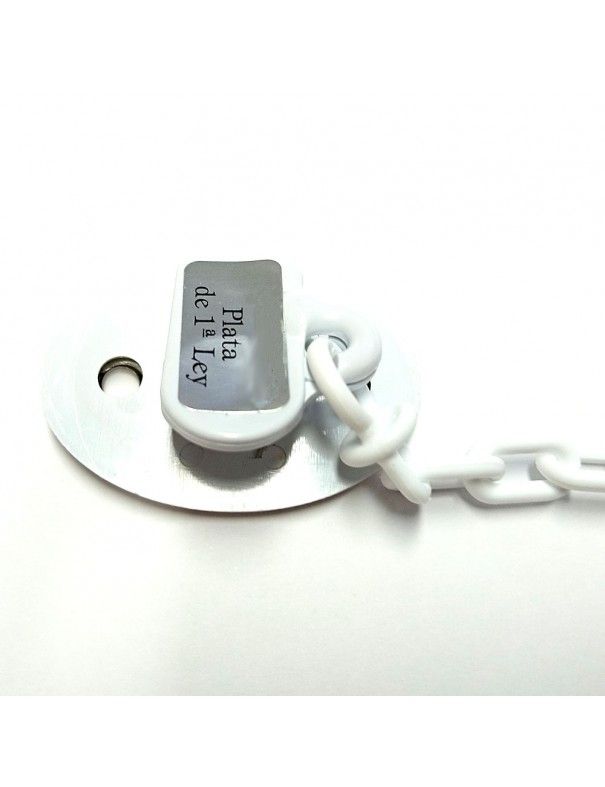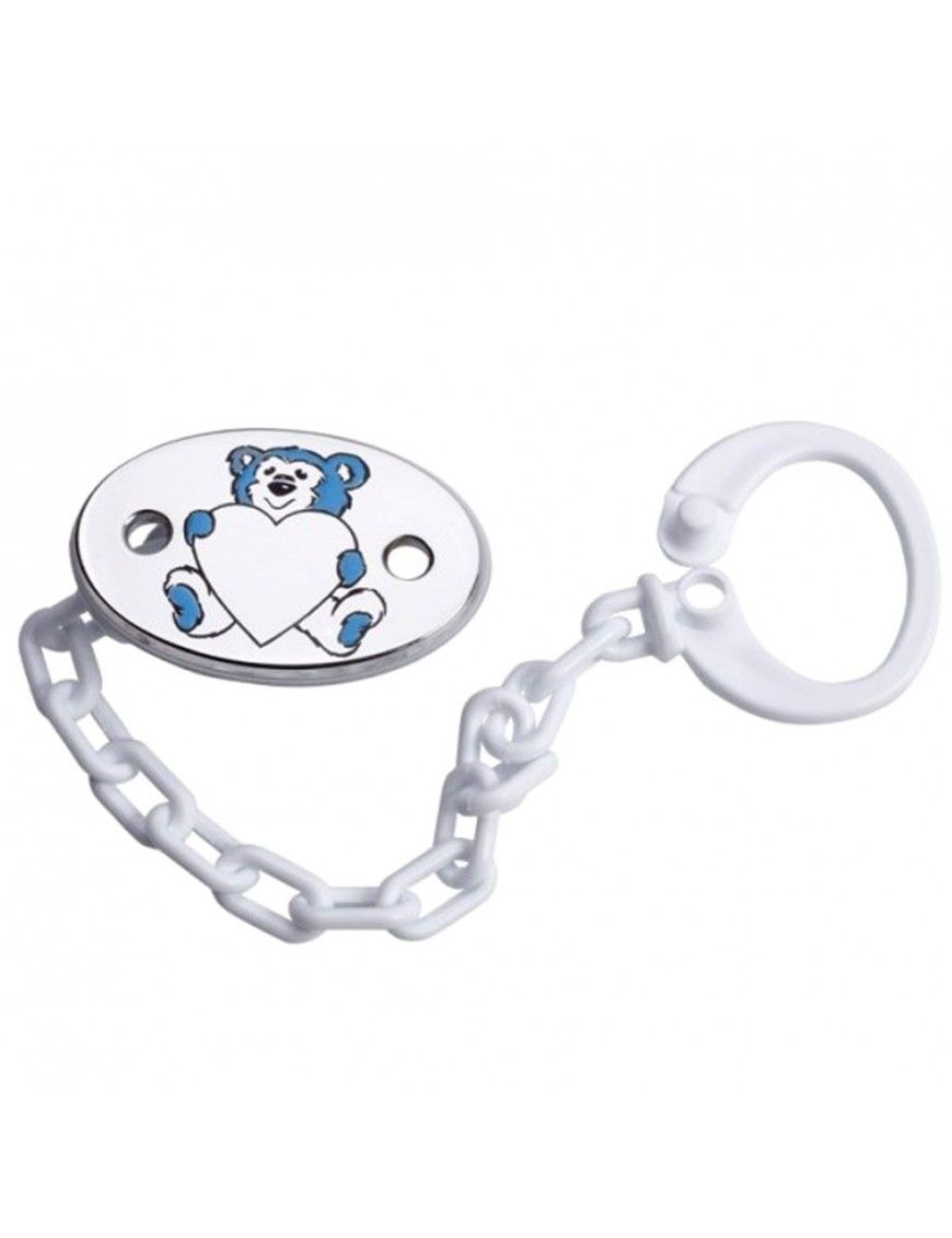Chupetero Plata Osito Corazón Azul 9A0153ES, en plata de primera ley 925mls. Medidas de 45X34mm. Cadena de plástico de 14,5cm.