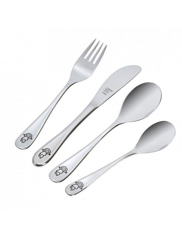 Juego Cubiertos Acero Filou CA0008, en acero inoxidable. Compuesto por cuatro piezas. Cuchara y tenedor de 15cm de largo. Cuchillo 17cm y cucharilla pequeña de 13cm de largo.