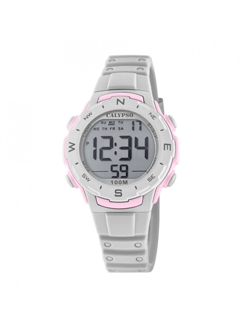 Reloj Calypso Crush Niña K5801/1, digital. Caja de plástico de 35mm de diámetro y pulsera de caucho. Función de alarma, cronómetro y cuenta regresiva. Sumergible a 10ATM, por lo que es apto para ducha y baño con inmersión (inmersión con botella).