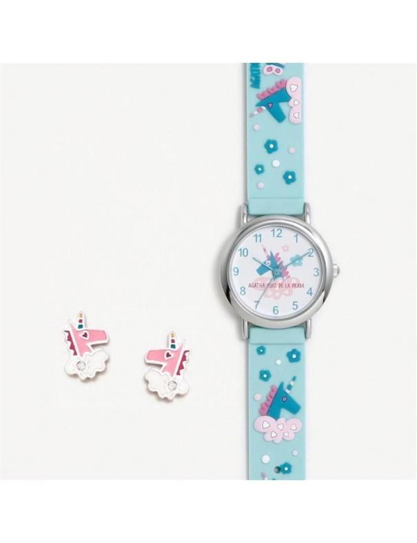 Pack reloj y pendientes Agatha Ruiz de la Prada unicornio AGR292A para niñas. El reloj es de plástico y la esfera mide 22 mm de diámetro. Los pendientes está fabricados en plata de primera ley y esmalte. Tiene cierre de presión. Garantía de tres años.